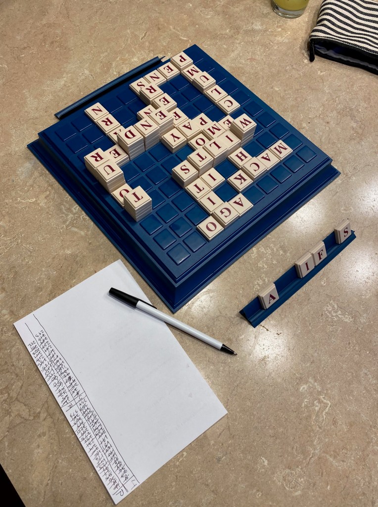 The final play of our UpWords game sees me stuck with one tile as my opponent goes out on a play of 6 points. Our final score 255 to 245 (240 after the -5). Some days, I will let my emotions get the better of me and just scrape the tiles off the board and back into the bag to start another game. If I’m in a better headspace, I’ll look over the board and think through what I could have done differently. My opponent (my wife) is formidable. Most times that she wins, I simply did not play as well as her. Even when I’ve had bad luck with tiles, I can still point to decisions I made that could have changed the game in my favor. Generally, I don’t alter my core strategy, I just look for ways to execute it more successfully.