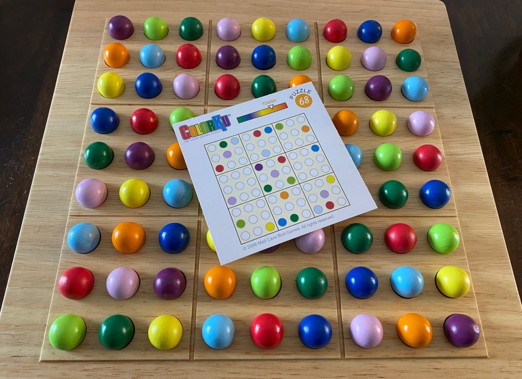 Colorku is a puzzle game consisting of 9 separate squares arranged in a 3×3 grid, each square having nine cradles for the nine different colored balls. You pull a puzzle card, arrange the colored balls in the cradles as shown; then proceed to finish the board, making sure that each square has all nine colors represented, and that each row and each column from end to end has all nine colors represented. No individual square, row or column can have duplicate colors.