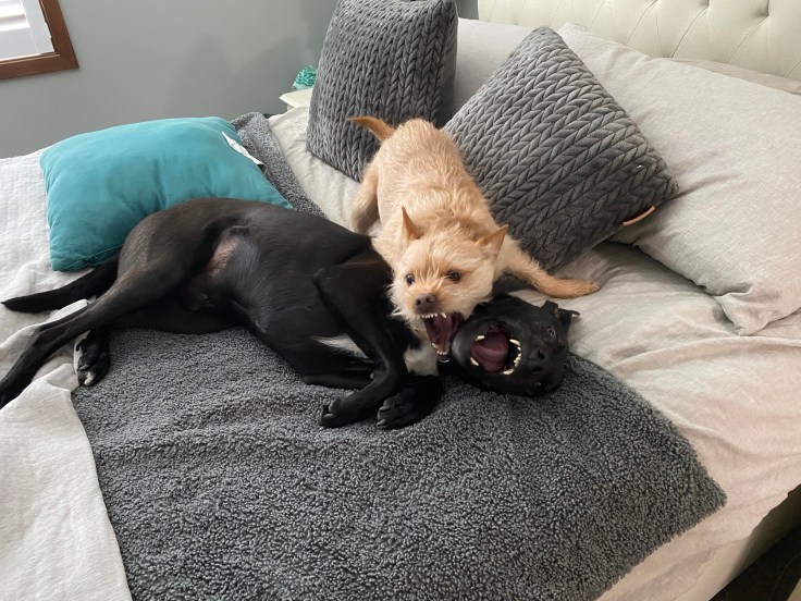 This is a good time to go on a brief tangent: rough & tumble play isn’t the only thing the play police don’t like and try to control. The play police don’t like anything that makes them uncomfortable or that has an unknown outcome. In nose work, the play police might not like that a dog is getting too “aroused”, or that a dog is acting in ways that don’t seem like “searching”. If you leave the dog be – or accept the dog’s state of being – quite often there is nothing you need to fear and nothing you need to control. But, play police will swear that a dog has to be protected from his own nature and can’t be allowed to make choices that will be bad for him. This is a false narrative pushed by the same people who would label rough & tumble play as “too much” and decide to stop it and “teach” everyone to behave. I’m not interested in behaving for someone else when there is no good reason to do so (note, I will certainly react for good reason, if a dog or human is truly in danger or a danger to themselves or others).